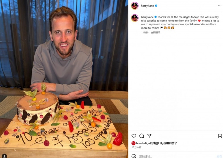 3月27日訊 今天是凱恩代表英格蘭隊首秀的10周年,凱恩在家中收獲了蛋糕。