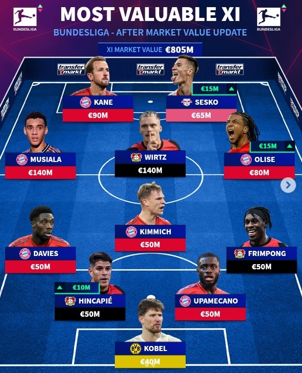 3月27日訊 德國轉(zhuǎn)會市場公布了德甲最貴陣,凱恩領(lǐng)銜的拜仁6將入選,維爾茨、塞斯科在列。