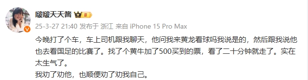 “啵啵天天醬”寫道:今晚打了個車,車上司機跟我聊天,他問我來黃龍看球嗎我說是的,然后跟我說他也去看國足的比賽了。找了個黃牛加了500買到的票,看了二十分鐘就走了。實在太生氣了。