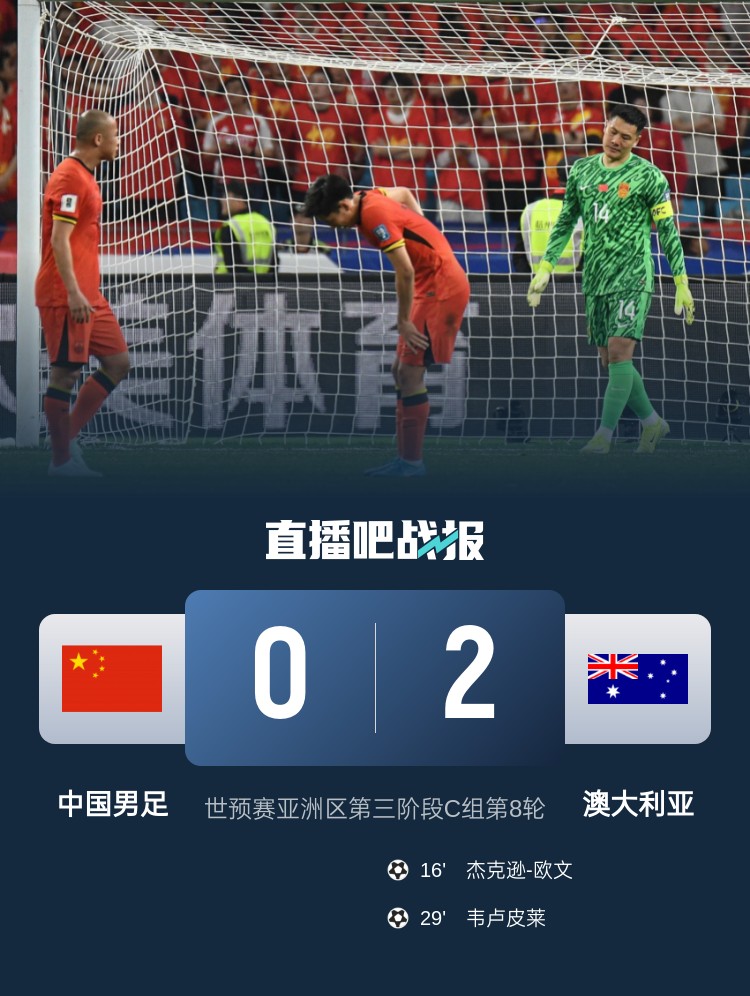 昨天的比賽中,國足在第16分鐘后防失誤導(dǎo)致對手進球,第29分鐘門將王大雷撲救失誤再丟一球,最終0-2不敵澳大利亞。