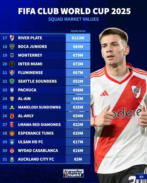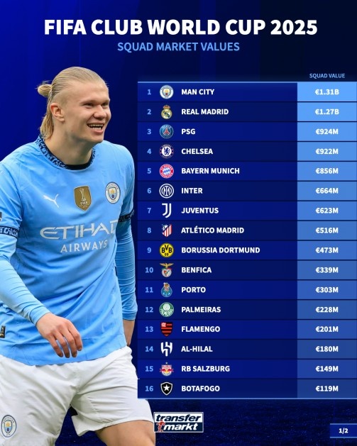 - 世俱杯參賽球隊身價排行:曼城13.1億歐居首 皇馬巴黎藍軍拜仁2-5