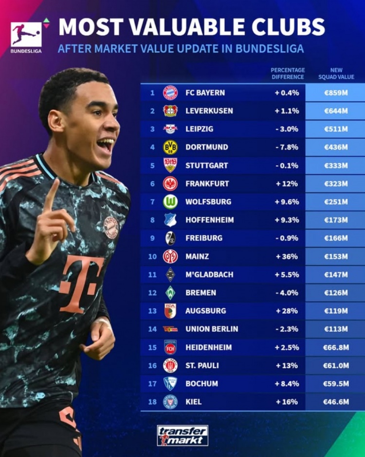 - 德甲球隊(duì)德轉(zhuǎn)身價(jià)榜:拜仁8.59億歐居首,藥廠萊比錫二三位