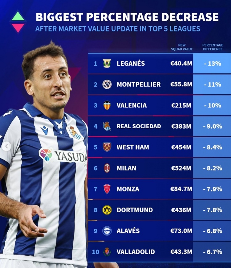 五大聯(lián)賽球隊(duì)身價(jià)貶值比例榜:米蘭多特下降約8%,皇社西漢姆在列