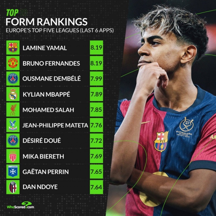 - whoscored近期狀態(tài)榜:亞馬爾&B費(fèi)居首 登貝萊&姆巴佩&薩拉赫在列