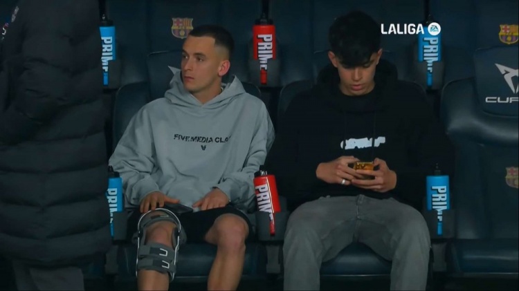 巴薩中場卡薩多本月被確認右膝外側(cè)韌帶部分撕裂,接受保守治療,預計將傷缺兩個月,他與另一位傷員伯納爾現(xiàn)場觀看了這場比賽,卡薩多更換發(fā)型、佩戴護具觀賽。