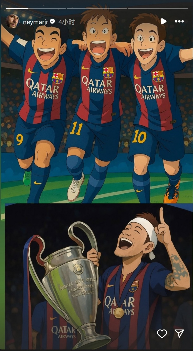 內(nèi)馬爾在社交媒體上曬出與梅西、蘇亞雷斯一起慶祝,以及自己手拿歐冠獎杯的漫畫圖片,追憶那段美好的時光。