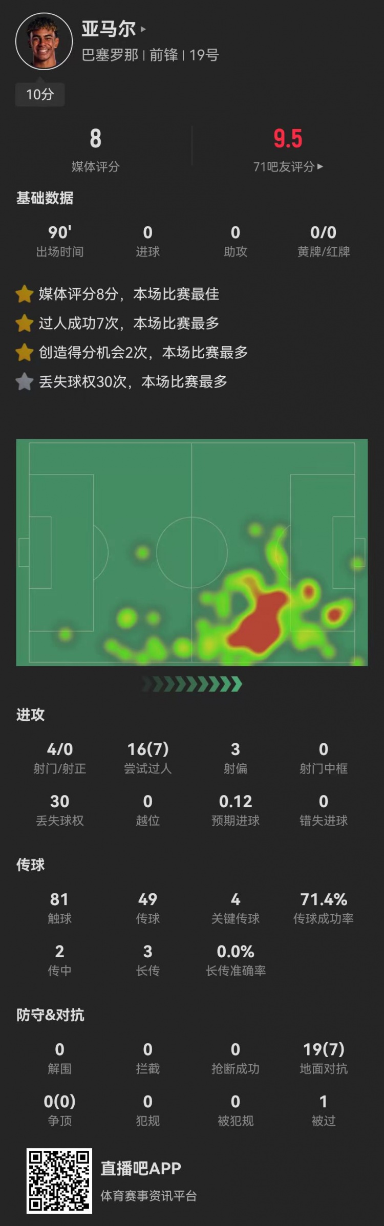 亞馬爾本場4射0正+4關(guān)鍵傳球 7成功過人+2造良機+30次丟失球權(quán)