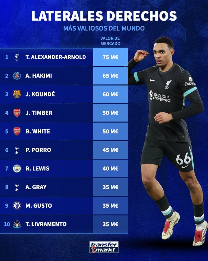 皇馬又免簽了個(gè)硬菜?德轉(zhuǎn)列右后衛(wèi)身價(jià):阿諾德7500萬(wàn)歐居首