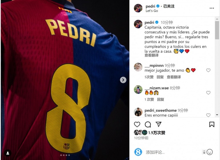 全場(chǎng)最佳!佩德里社媒:擔(dān)任隊(duì)長(zhǎng)+西甲8連勝,三分獻(xiàn)給巴薩球迷