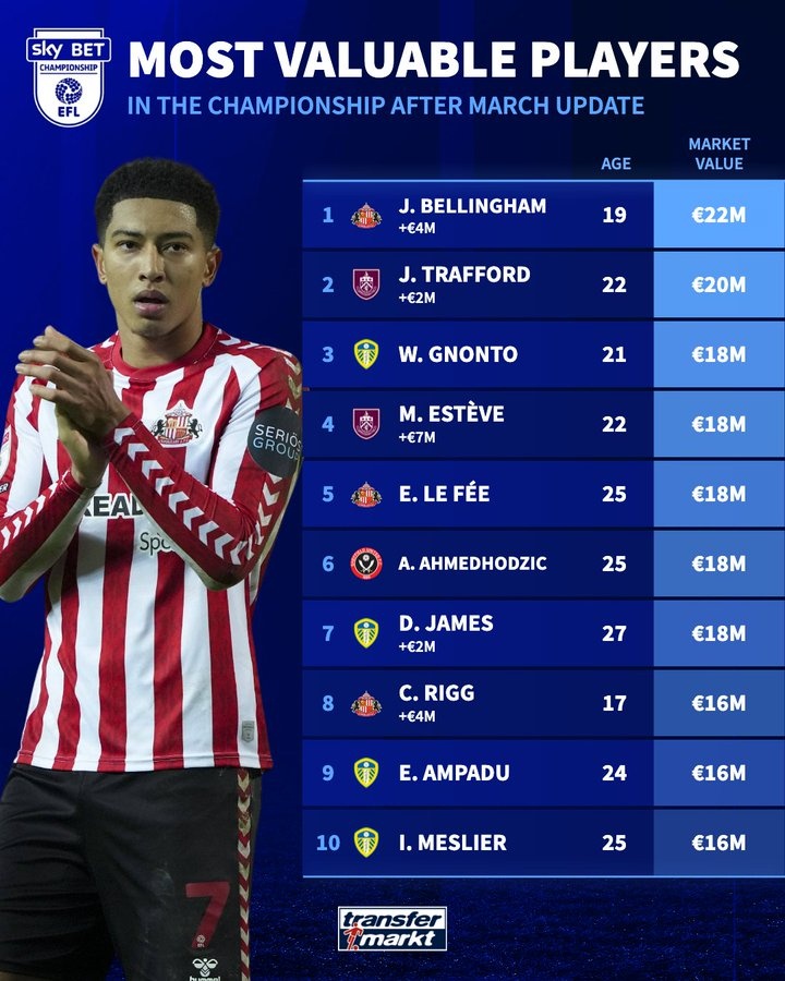 3月28日訊 德國轉(zhuǎn)會市場今日曬海報,列出英冠球員身價排名,小貝林厄姆2200萬歐元居首。