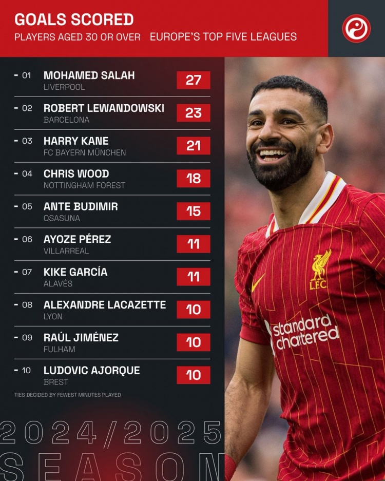 - 本賽季五大聯(lián)賽僅3名30+球員打進20+聯(lián)賽進球:薩拉赫、萊萬、凱恩