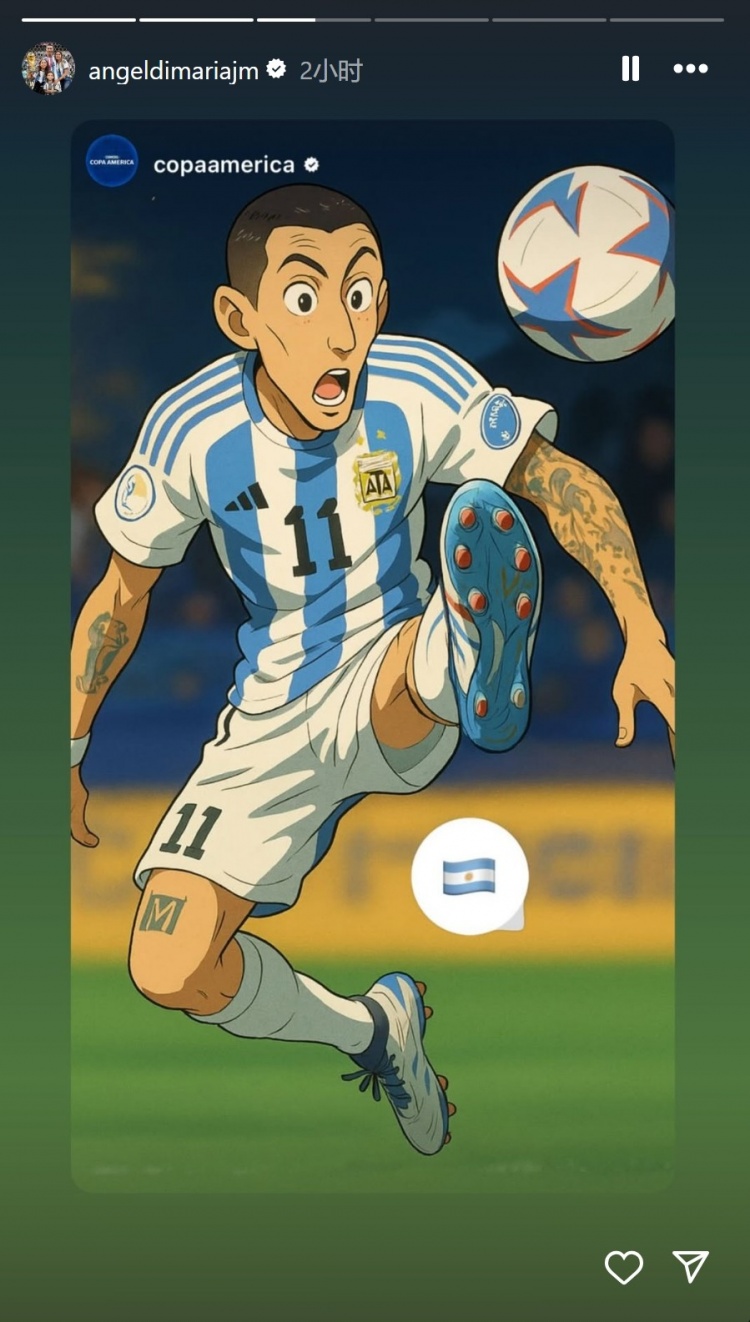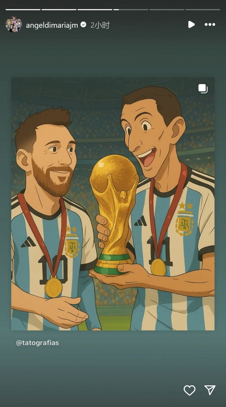 3月29日訊 迪馬利亞更新社媒動(dòng)態(tài),轉(zhuǎn)發(fā)與梅西手捧大力神杯的AI漫畫圖片。