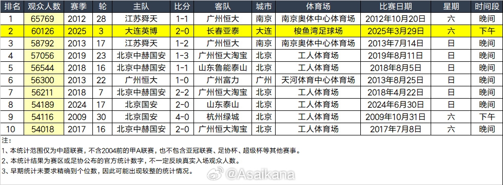 - 大連英博和長春亞泰吸引60126名觀眾現(xiàn)場觀戰(zhàn),中超歷史排名第二