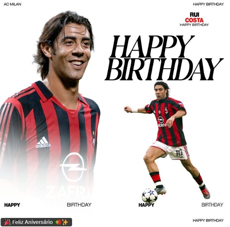 3月29日訊 今天是前葡萄牙國腳魯伊-科斯塔53歲生日,AC米蘭官推也曬出海報為這位昔日中場大師送上生日祝福。