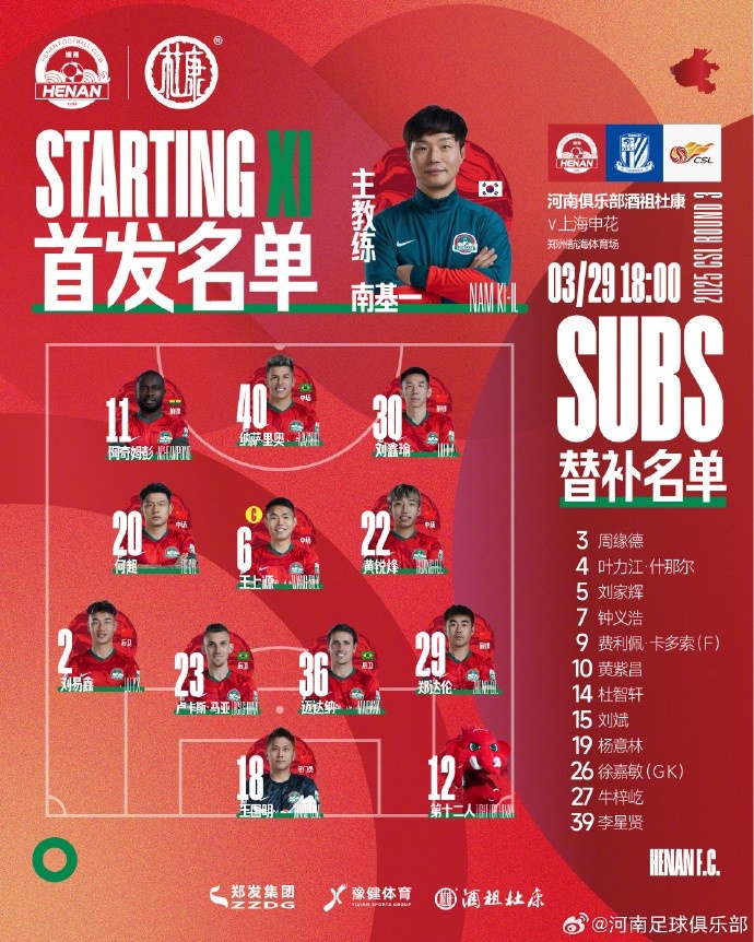 河南俱樂(lè)部酒祖杜康VS上海申花 首發(fā)及替補(bǔ)隊(duì)員名單