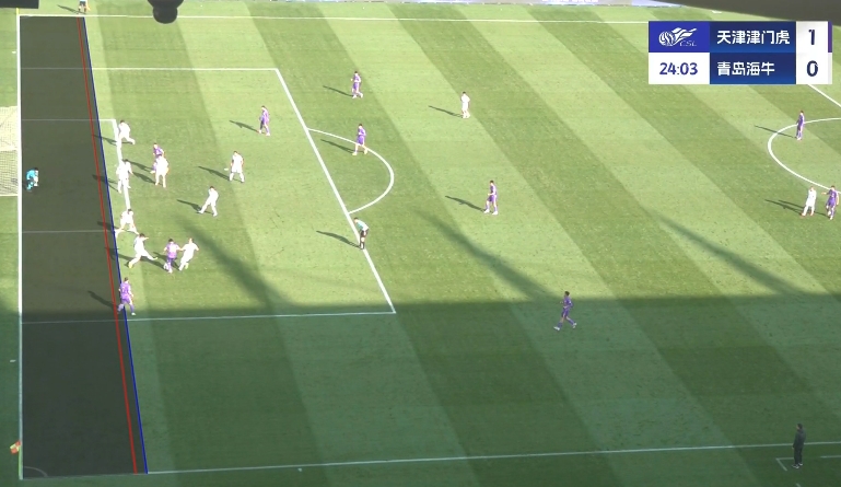 比賽第23分鐘,巴頓禁區(qū)內抽射破門,隨后VAR介入,判罰阿代米在接應王秋明傳球時越位在先,進球無效。場上比分仍為津門虎1-0海牛。