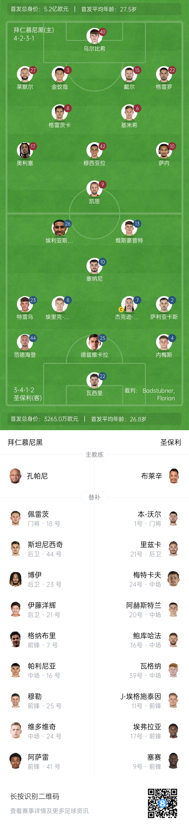 拜仁首發(fā):40-烏爾比希、3-金玟哉、15-戴爾、27-萊默爾、22-格雷羅、6-基米希、8-格雷茨卡、17-奧利塞、42-穆西亞拉、10-薩內(nèi)、9-凱恩
