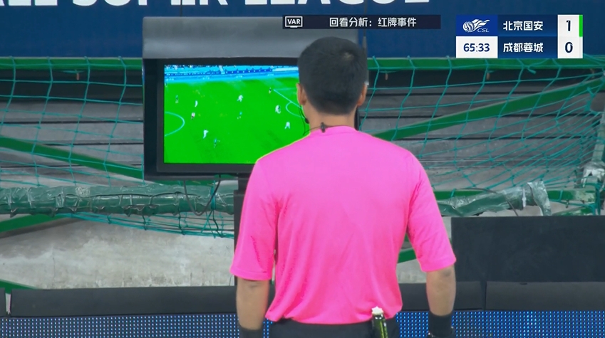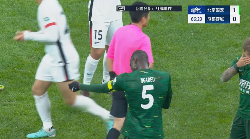 比賽第66分鐘,恩加德烏后場(chǎng)拿球被搶斷,無奈放倒費(fèi)利佩犯規(guī),主裁馬寧起初出示黃牌,隨后VAR介入,馬寧去場(chǎng)邊查看后改判直紅!場(chǎng)上比分國(guó)安1-0蓉城。