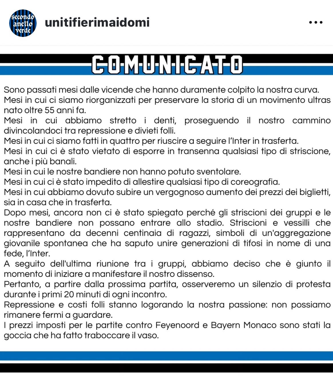 - 國米北看臺:比賽前20分鐘保持沉默,抗議票價過高&禁止標語入場