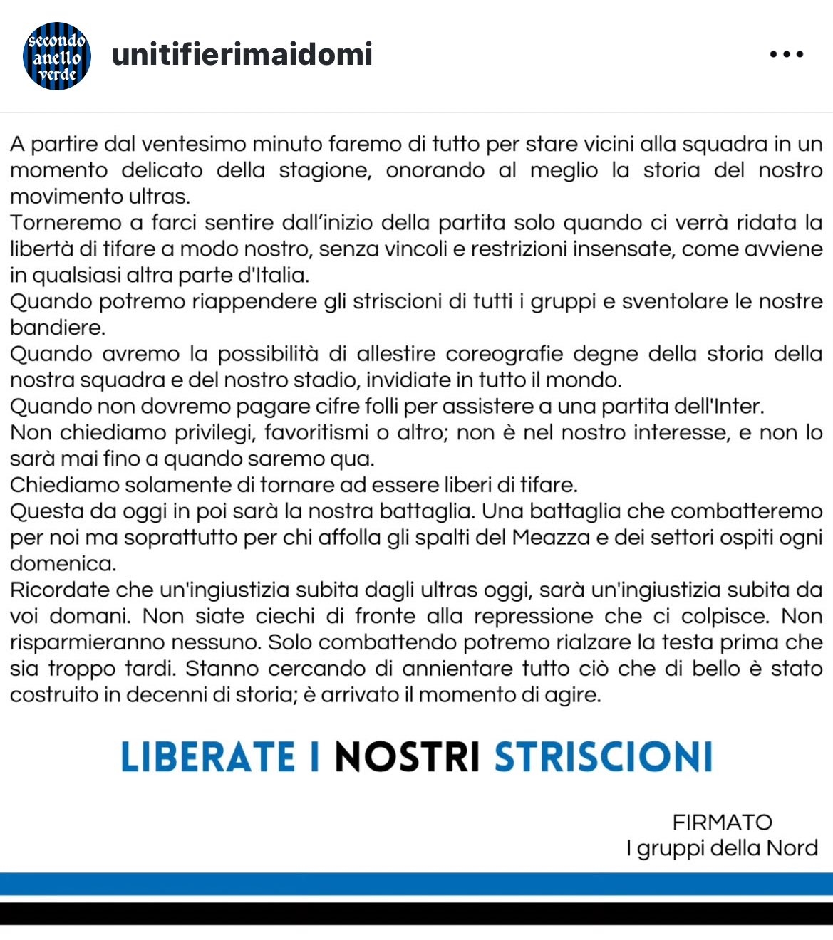 只有當我們重新獲得以自己的方式歡呼的自由時,我們才會重新讓自己的聲音響起。不受毫無意義的約束和限制,就像在意大利的任何其他球場發(fā)生的那樣。
