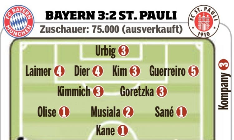 3月30日訊 拜仁在本輪德甲3-2險(xiǎn)勝圣保利,《圖片報(bào)》也在賽后為球員進(jìn)行了評(píng)分。