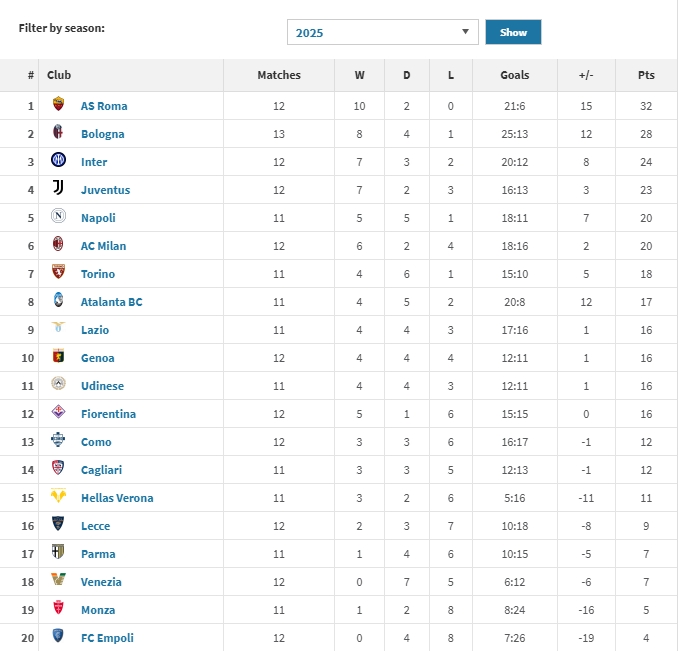 早來(lái)就爭(zhēng)冠了?意甲2025年拿分榜:羅馬32分領(lǐng)跑 博洛尼亞28分第2