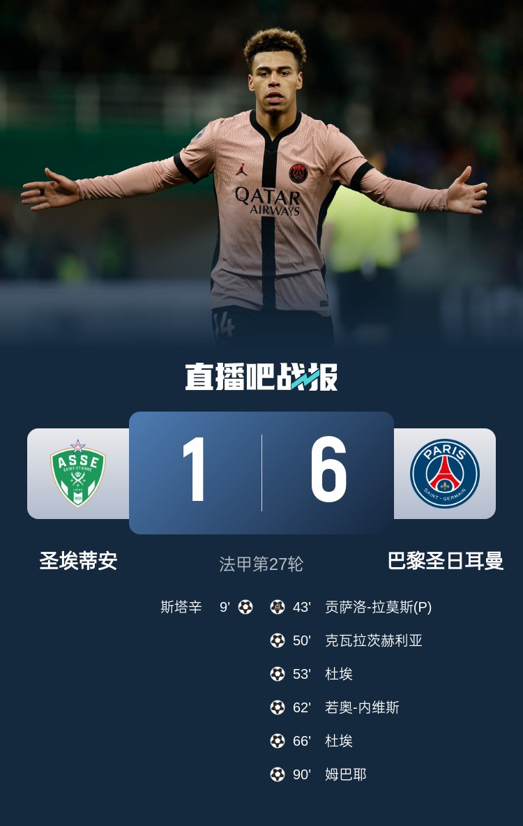 法甲第27輪,巴黎6-1大勝圣埃蒂安,暫以22分優(yōu)勢領(lǐng)跑。上半場,斯塔辛首開紀(jì)錄,貢薩洛-拉莫斯點射扳平;下半場,克瓦拉茨赫利亞擴大比分,內(nèi)維斯破門,杜埃梅開二度,姆巴耶打進一球。