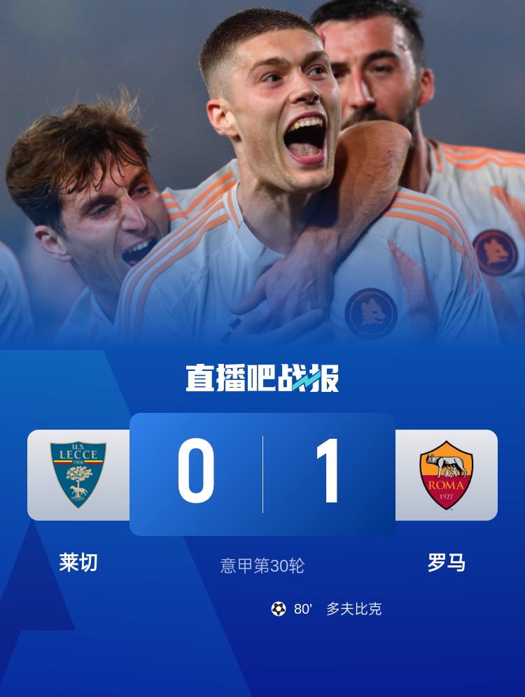 意甲第30輪,萊切0-1羅馬。上半場,科內(nèi)錯失良機;下半場,小曼奇尼進球被吹,多夫比克低射制勝。