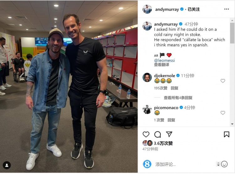 3月30日訊 德約科維奇現(xiàn)任教練、三座大滿貫得主穆雷更新社媒動態(tài),曬出與梅西的合照。