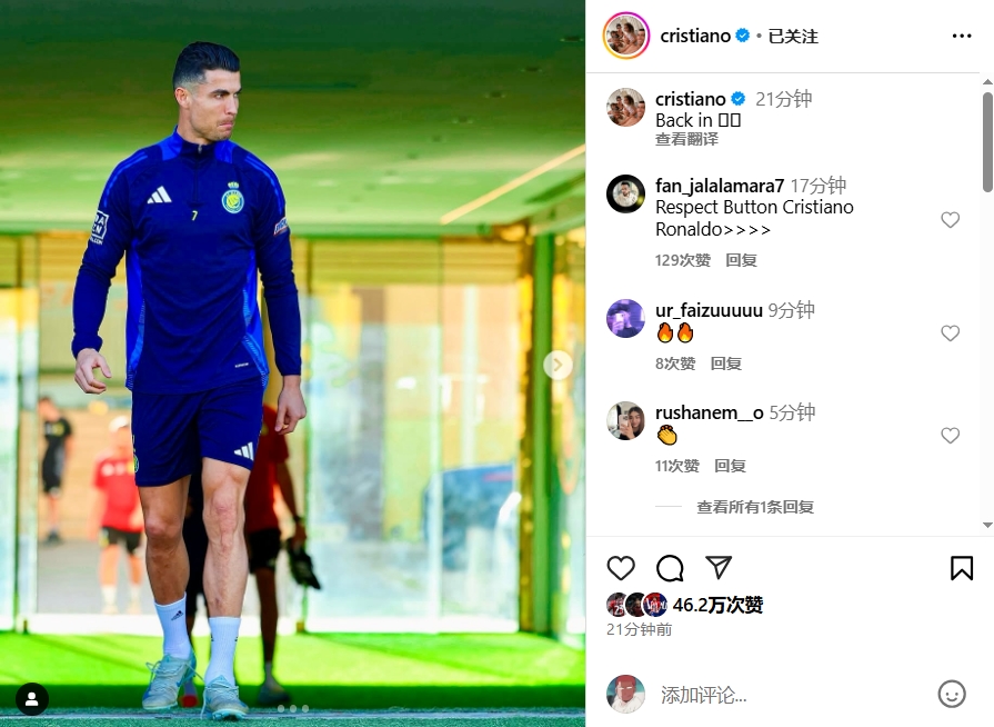 - 回歸訓練!C羅社媒曬照身穿利雅得勝利訓練服,配文:Back in