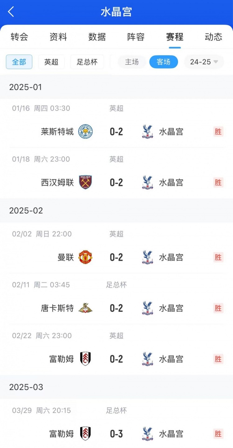 - 各項(xiàng)賽事客場(chǎng)6連勝+0丟球,水晶宮是英格蘭頂級(jí)聯(lián)賽歷史首隊(duì)