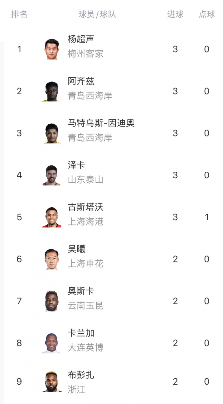- 中超射手榜:楊超聲、澤卡、阿齊茲、馬特烏斯、古斯塔沃3球居首