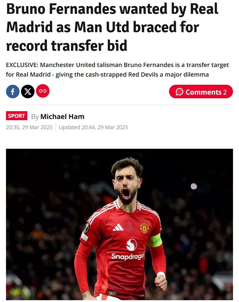 據(jù)英國《每日星報》獨家消息,皇馬可能考慮向曼聯(lián)支付9000萬英鎊的轉(zhuǎn)會費,以挖角B費。