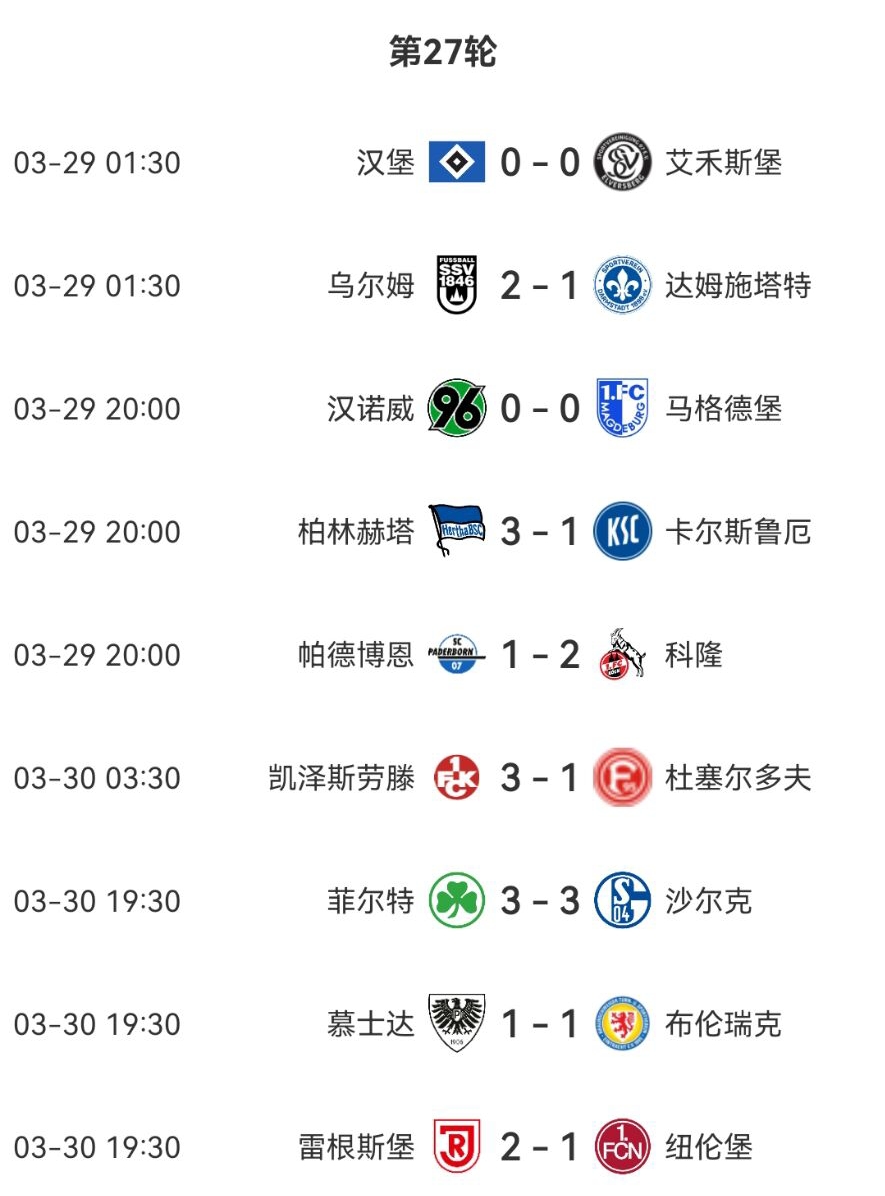 03月30日訊 德乙結(jié)束第27輪比賽,本輪積分榜前中段多支球隊(duì)丟分,原本榜首的漢堡戰(zhàn)平積分被科隆反超,k神執(zhí)教的紐倫堡不敵副班長(zhǎng)雷根斯堡,錯(cuò)失了寶貴的追分機(jī)會(huì)。