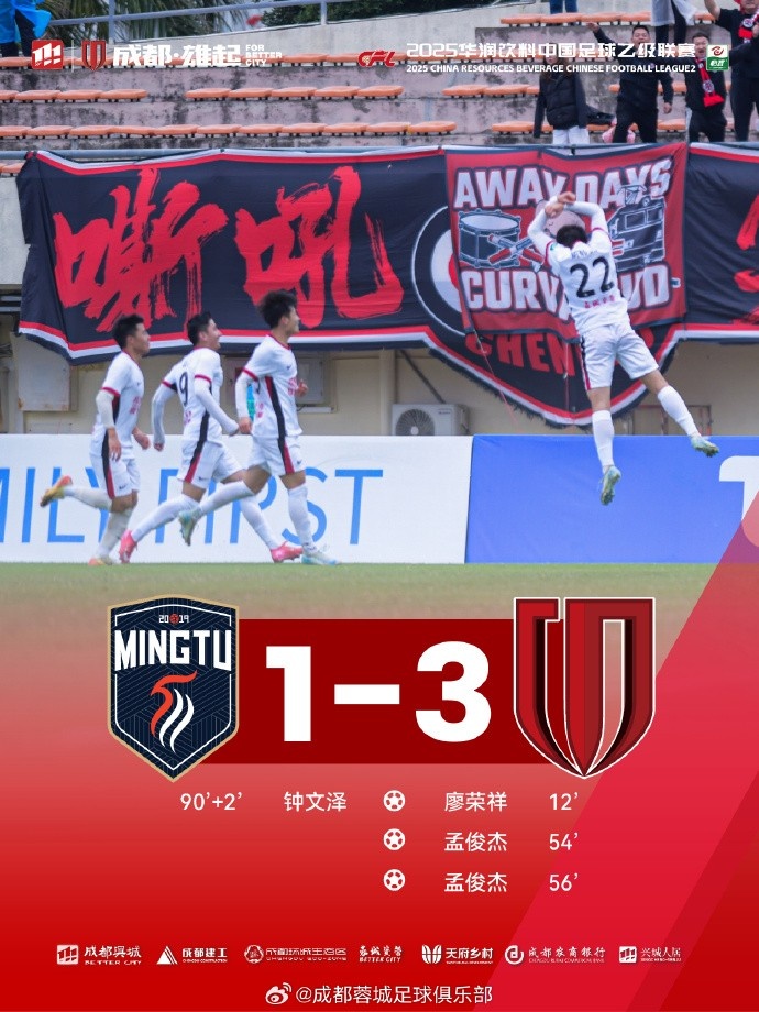 在今天下午進行的中乙第2輪成都蓉城B隊與廣東銘途的比賽中,上半場,孟俊杰創(chuàng)造點球機會,廖榮祥點射破門;下半場,孟俊杰3分鐘內(nèi)梅開二度,廣東銘途補時階段扳回一球。最終,成都蓉城B隊3-1擊敗對手,收獲兩連勝。