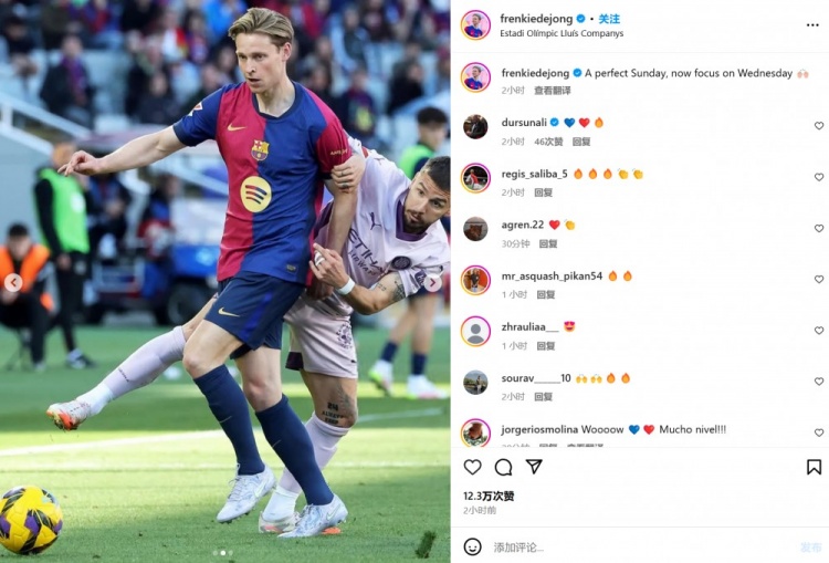 德容也在今日通過社媒曬出比賽照紀念勝利,并配文:“一個完美的周日,接下來專注于周三。”