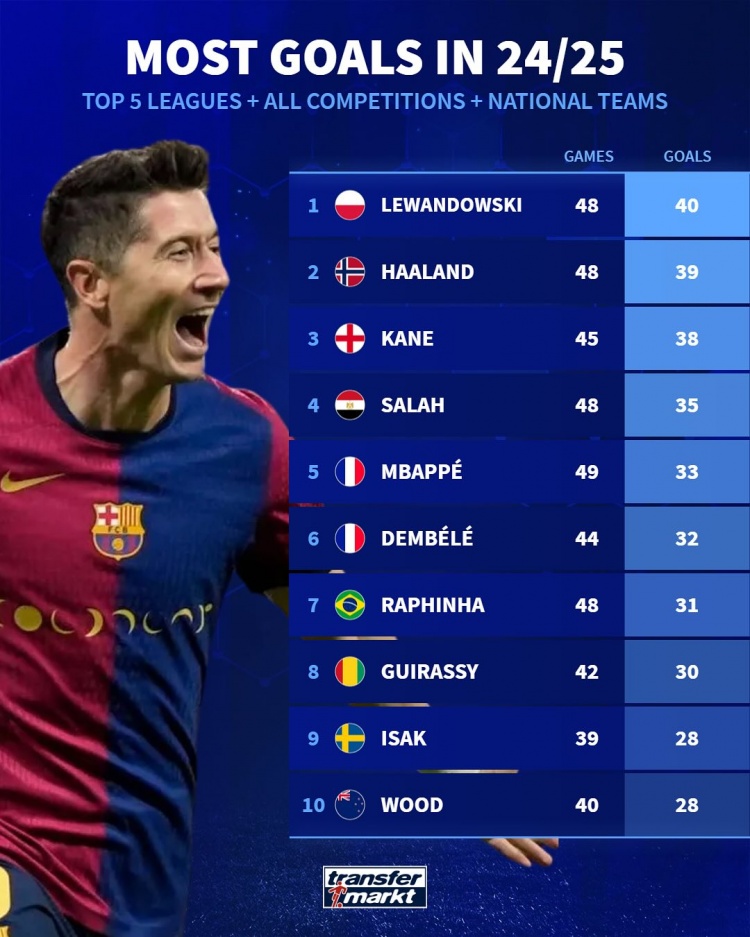 - 本賽季五大聯(lián)賽球員進(jìn)球榜:36歲萊萬40球居首,哈蘭德、凱恩前三