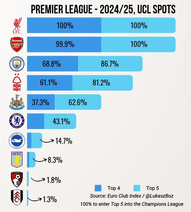 下賽季,英超前五將獲得歐冠資格,以下為2024-25賽季英超球隊(duì)前四/前五概率: