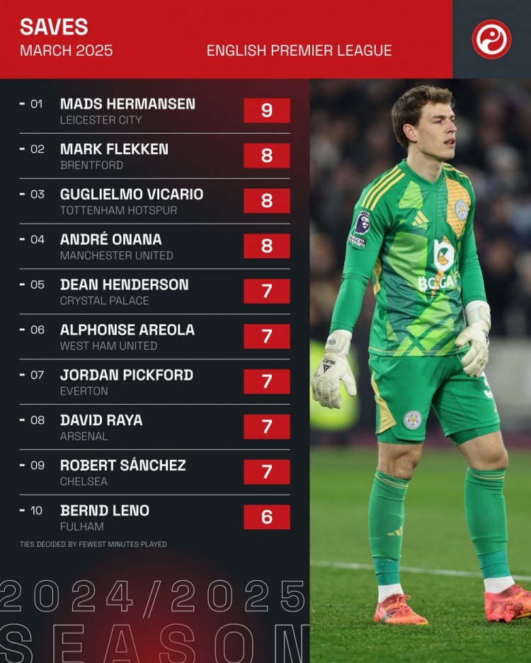 4月1日訊 Squawka統(tǒng)計(jì)了3月份英超門(mén)將的撲救次數(shù),并列出榜單,赫爾曼森9次居首,弗萊肯、維卡里奧、奧納納8次并列第二。