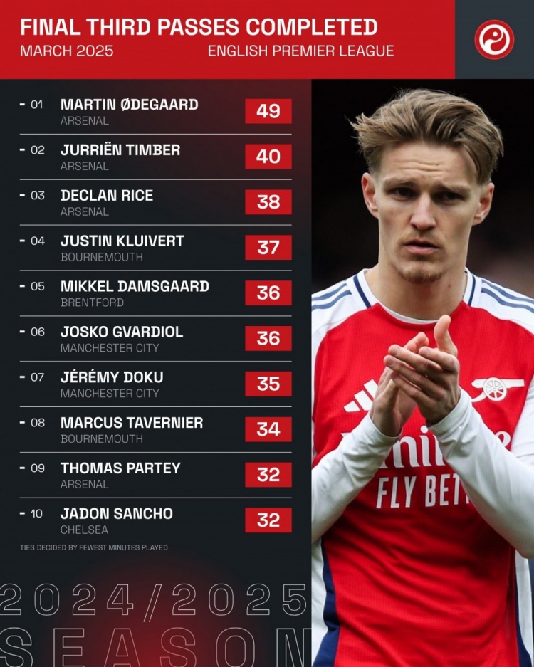 - 英超3月進(jìn)攻三區(qū)成功傳球排名:厄德高49次居首,阿森納包攬前三