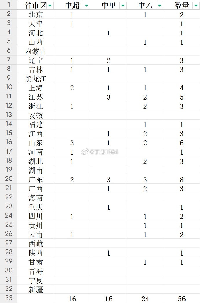 三級(jí)職業(yè)聯(lián)賽球隊(duì)分布:廣東省8隊(duì)最多,山東省6隊(duì)第二江蘇省第三