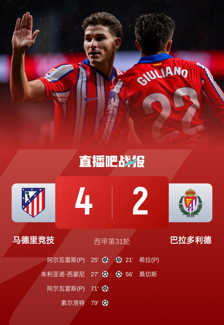 馬競(jìng)4-2逆轉(zhuǎn)巴拉多利德,阿爾瓦雷斯兩球,朱利亞諾-西蒙尼和索爾洛特破門(mén)。