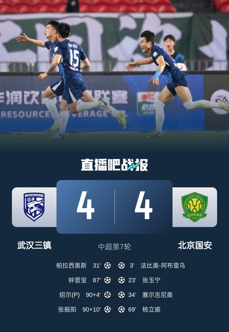 隨后,武漢三鎮(zhèn)主場奇跡般地4-4絕平北京國安,兩隊更是聯(lián)手貢獻(xiàn)8個進(jìn)球。
