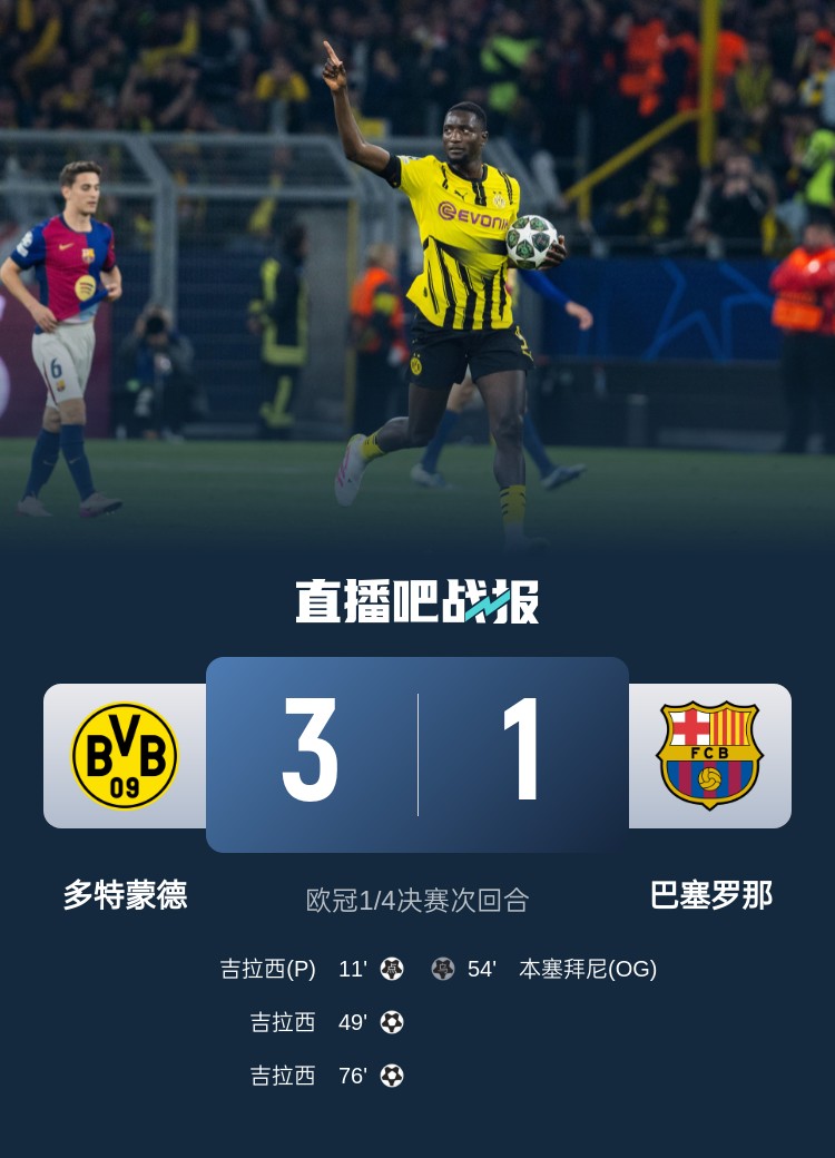 歐冠1/4決賽次回合,多特3-1總比分3-5巴薩。上半場(chǎng),什琴斯尼送點(diǎn),吉拉西點(diǎn)射首開(kāi)紀(jì)錄,格羅斯單刀破門被吹;下半場(chǎng),吉拉西雙響上演帽子戲法,費(fèi)爾明造烏龍。