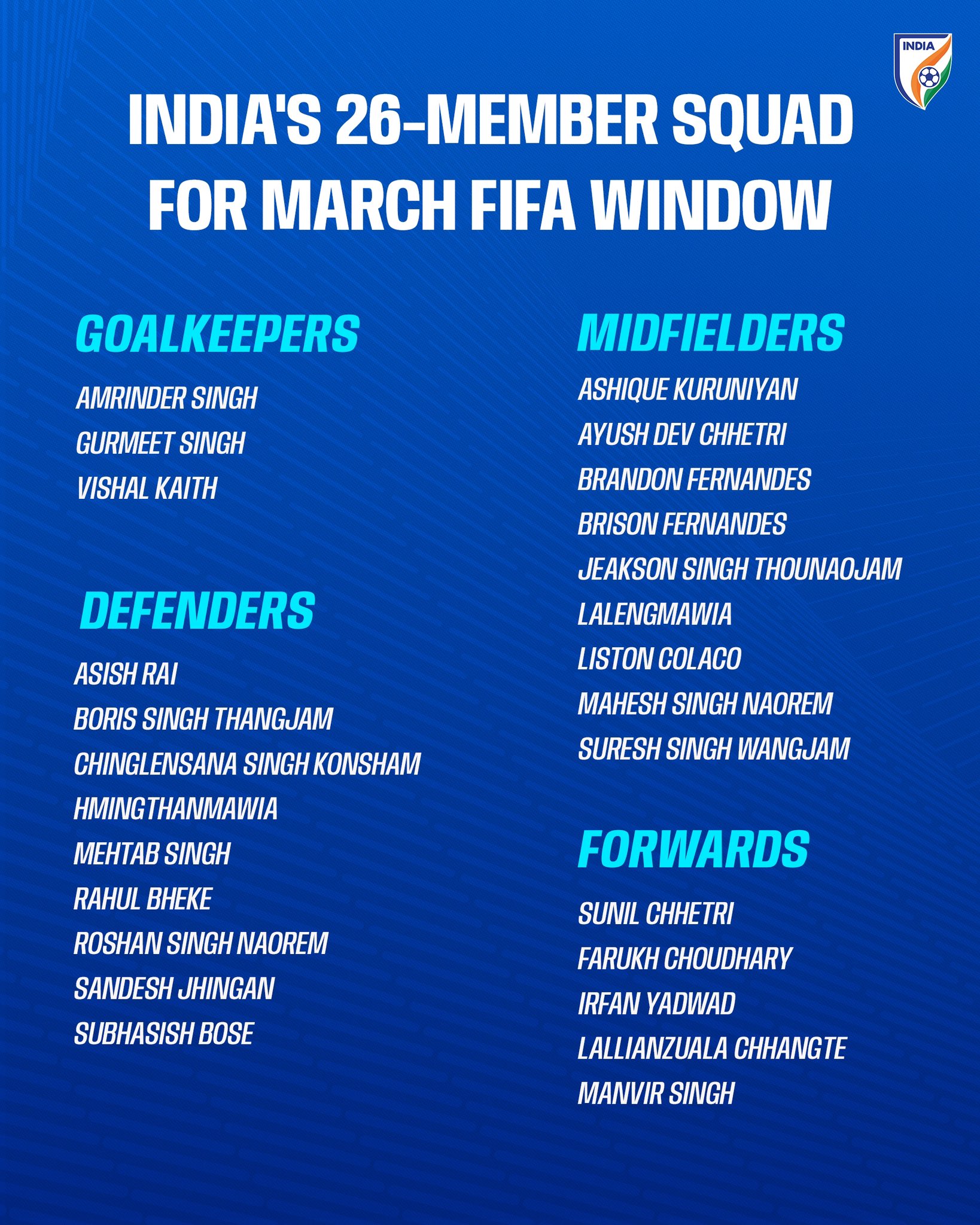 印度將在3月19日友誼賽對陣馬爾代夫,3月25日亞足聯(lián)亞洲杯預選賽對陣孟加拉國。