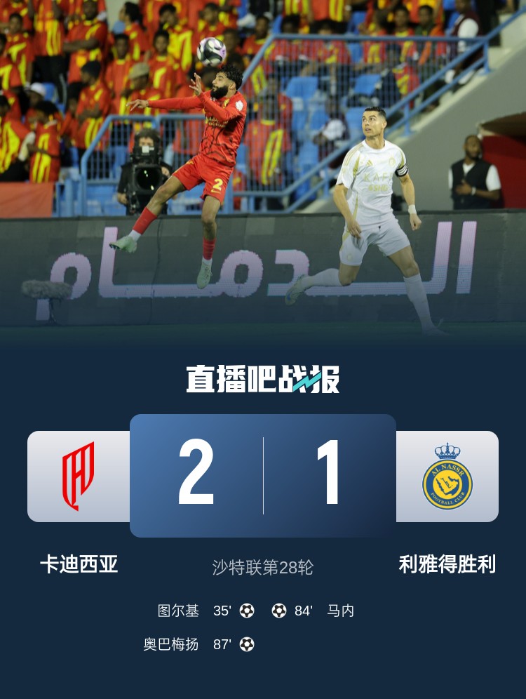 沙特聯(lián)第28輪,利雅得勝利客場1-2卡迪西亞,4輪不敗終結(jié)。上半場,圖爾基補(bǔ)射建功;下半場,杜蘭近距離失良機(jī),馬內(nèi)84分鐘扳平比分,奧巴梅揚(yáng)87分鐘絕殺。