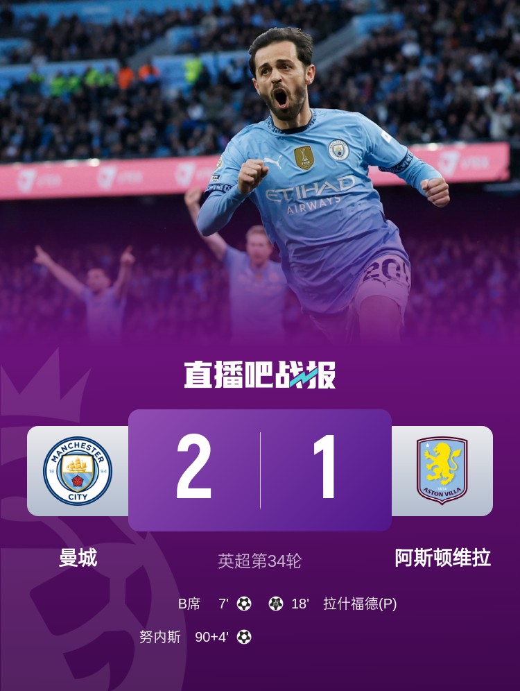 英超第34輪,曼城2-1戰(zhàn)勝維拉,終結(jié)維拉英超5連勝。上半場,拉什福德開場中柱,隨后B席破門,迪亞斯送點,拉什福德點射扳平;下半場,馬爾穆什破門但越位無效,多庫94分鐘助攻努內(nèi)斯絕殺。