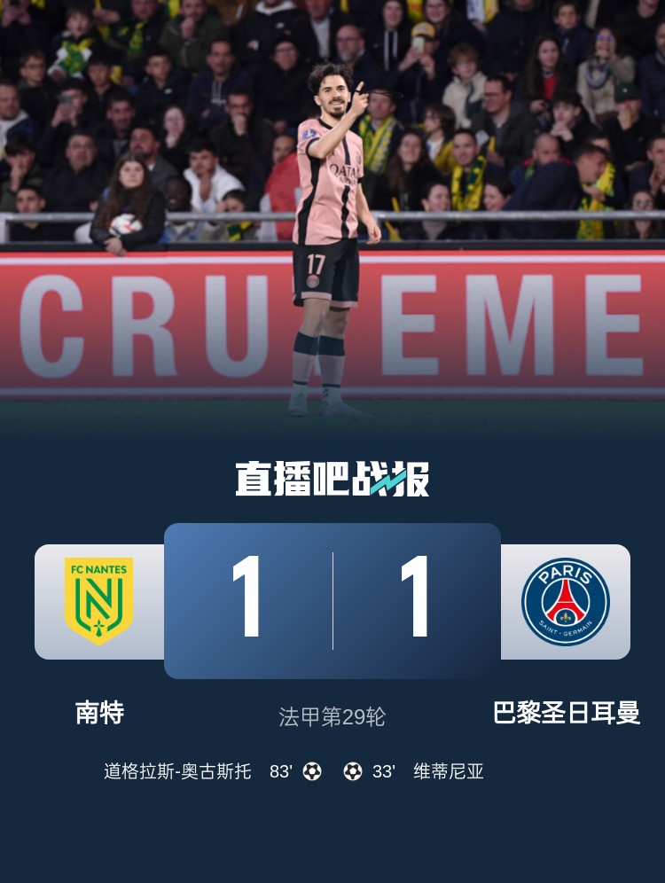 法甲第29輪,巴黎1-1戰(zhàn)平南特。上半場,維蒂尼亞幫助巴黎取得領(lǐng)先;下半場,道格拉斯-奧古斯托幫助南特扳平。