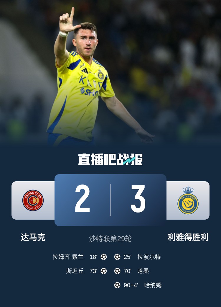 沙特聯(lián)第29輪,利雅得勝利客場3-2逆轉(zhuǎn)達馬克。上半場,索蘭先拔頭籌,拉波爾特扳平比分;下半場,哈桑替補反超,斯坦丘3分鐘追平,哈納姆補時94分鐘絕殺。