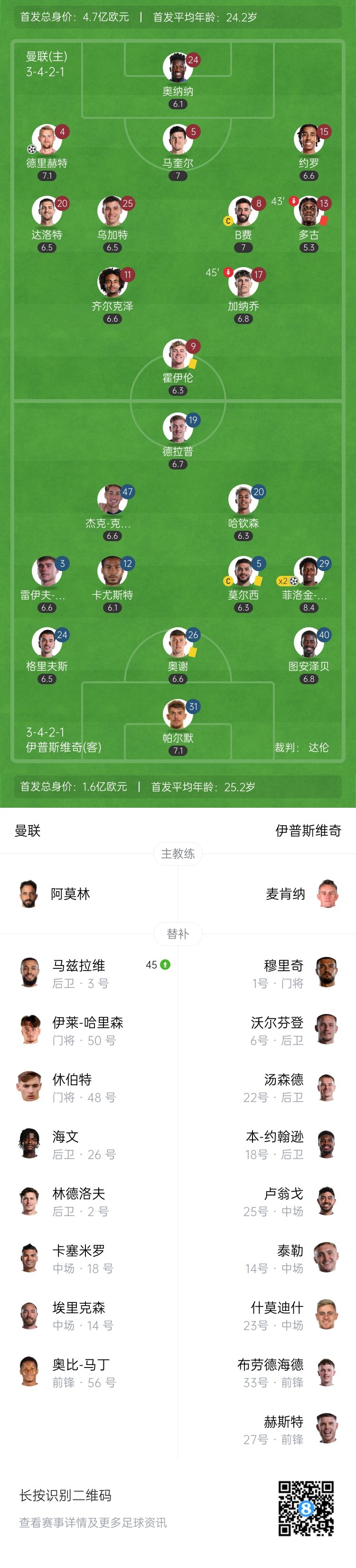 第26分鐘,曼聯(lián)反超!B費主罰角球開向后點,馬奎爾頭球攻門!被門將撲出,達洛特倒地掃射再被撲出!德里赫特跟上再來一腳!曼聯(lián)2-1反超伊普斯維奇↓